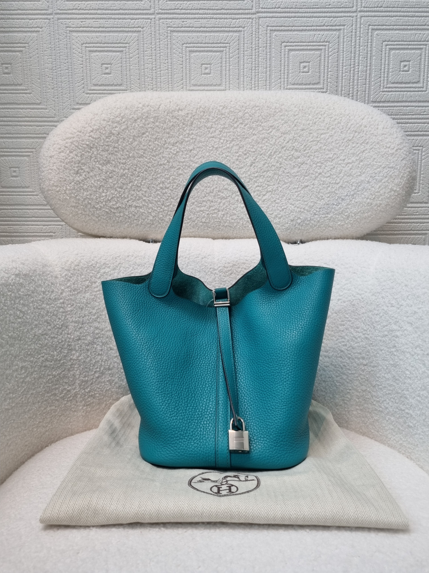 Hermes Blue Green Clemence Leather Picotin Bag Stamp X (2016) with Entrupy Cert, dust bag, bag organizer and padlock.